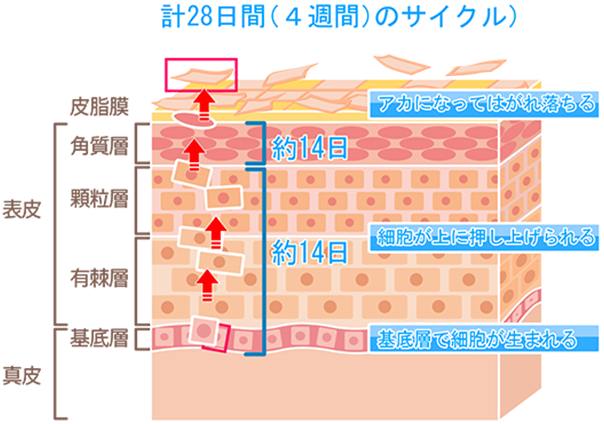 赤ちゃんの肌がいつもツヤツヤでケガをしてもすぐに治るのは、このターンオーバーのサイクル(細胞が新しく生まれ変わる周期)が短いからです。